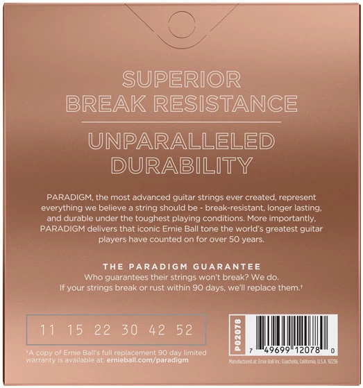 PARADIGM Wickeldraht nutzt einen exklusiven, plasmagestützten Prozess zur Fehlerbeseitigung und einer stark verbesserten Korrosionsfestigkeit. Ernie Balls patentierte Everlast Nanotechnologie wird nach dem Wickeln der Saiten angewendet und ändert die Art und Weise, wie sie auf Feuchtigkeit und Fette reagieren. Das Ergebnis sind Saiten, die länger halten und frischer klingen – ohne die unerwünschten Nebeneffekte einer beschichteten Saite.