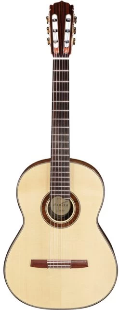 Aus sehr hochwertigen vollmassiven Tonhölzern gefertigt, ist diese Gitarre in Hochglanzoptik mit einer kuppelgewölbten Decke und 7-fach Fächerbeleistung ausgestattet. Die gebuchste goldfarbene Mechanik mit Ebenholzwirbel, der aus bestem Hartholz durchgängig versperrte Cedro-Hals, das hochwertige Ebenholz-Griffbrett sowie die3-lagige Palisander-Ahorn-Makassar-Kopfplatte zeigen die hohe Qualität der 58 BF. Die gesamte Gitarre ist mit einem UV-härtenden Acryllack hochglanzlackiert.