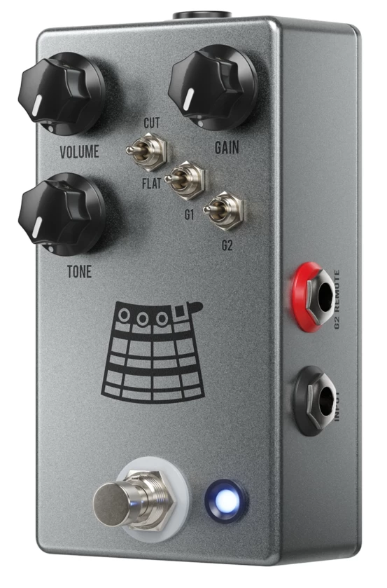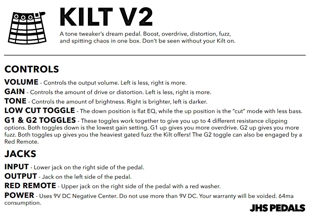 Der JHS Kilt V2 verfügt nach wie vor über den fantastischen Schaltkreis der Vorgängerversion, allerdings mit super wenig Nebengeräuschen, verbesserter Slew Rate für sanfteren, strukturierteren Overdrive mit einem Charakter, der sich noch besser anfühlt als der des originalen Expandora Overdrives auf dem die Schaltung basiert. Der Cut/Flat Kippschalter gibt dir die Option das Low End zu Cutten, für einen beefigeren Sound als ihn der Expandora bietet. G1 und G2 Kippschalter lassen dir verschiedene Zerr-Sounds, von leichtem, transparenten Drive bis hin zur Wand aus Fuzz und Distortion und allem dazwischen. Außerdem verfügt die V2 über die Möglichkeit den G2 Toggle per Red Remote Fußschalter zu aktivieren, sodass du On-the-Fly auf heftigen Overdrive oder Fuzz umschalten kannst!