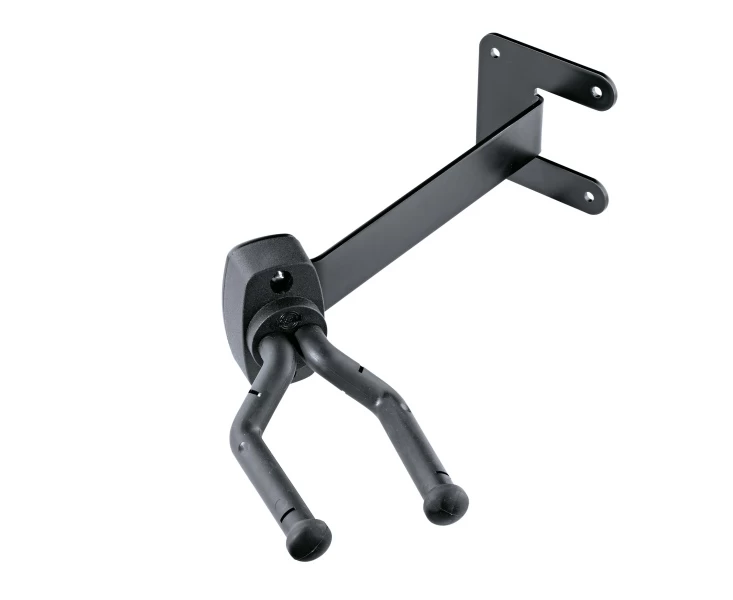 Der weltweit bewährte Gitarrenwandhalter 16280 in Kombination mit einer attraktiven Wandhalterung aus stabilem Stahlblech. Komfortable Aufnahme der Gitarre dank eines 30° Winkels. So können auch mehrere Gitarren platzsparend hintereinander aufgehängt werden. Beidseitig verwendbar. Die robusten Haltearme sind komplett gummiummantelt und schützen die Gitarre vor Kratzern und Beschädigungen. Die beweglichen Bügel passen sich selbstklemmend jeder Gitarre beim Einhängen an. Daher ist der Wandhalter auch für Gitarren mit asymmetrischer Kopfplatte bestens geeignet