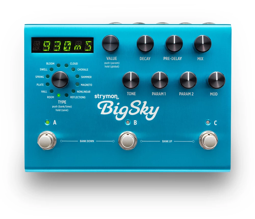 12 verschieden Hallprogramme sind die Basis des Big Sky Pedals. Die Umsetzung von legendären Reverbeffekten war Strymon aber nicht genug. So verfügt Big Sky über umfangreiche Kontrollmöglichkeiten, die unter anderem zwei freibelegbare Potis, einen Expressionpedalanschluss und einen Cabinet-Ausgang beinhalten. Letzterer bietet die Möglichkeit ganz ohne Amp das Gitarrensignal in ein Pult oder eine Audiokarte zu speisen und eine Speakersimulation zuzuschalten.